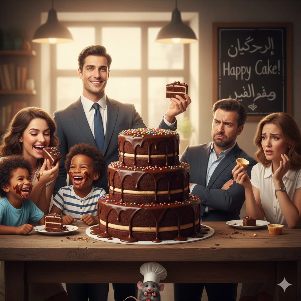 في المقصف، كان المشهد كالتالي: طبق واحد متبقٍ من كعكة الشوكولاتة العملاقة، والتي كانت تبدو وكأنها هبطت للتو من كوكب الحلويات. جورج تنهد براحة. لكن، فجأة، وقبل أن تصل يده إليها، انقضت عليها يد أخرى. كانت يد بيرسي، محاسب القسم المالي، الرجل الهادئ ذو النظارات السميكة الذي لم يكن معروفًا بأي نشاط جسدي يتجاوز تقليب الصفحات. جورج تجمد. "ماذا فعلت؟" همس جورج بصوت يشبه صوت حشرجة قطار قديم. بيرسي، الذي كان بالفعل قد ابتلع نصف القطعة في لقمة واحدة، نظر إليه بعيون واسعتين وقال بصعوبة بالغة من بين قطع الكعك المتناثرة حول فمه: "آه... هل كنت تريدها؟" جورج لم يستطع حتى تكوين جملة مفيدة، فكل ما خرج منه كان "أهووووو...!"، وهو صوت يجمع بين الشوق والألم والغضب، مما جعل سيدة تنظيف الطاولات تسقط المكنسة من يدها.