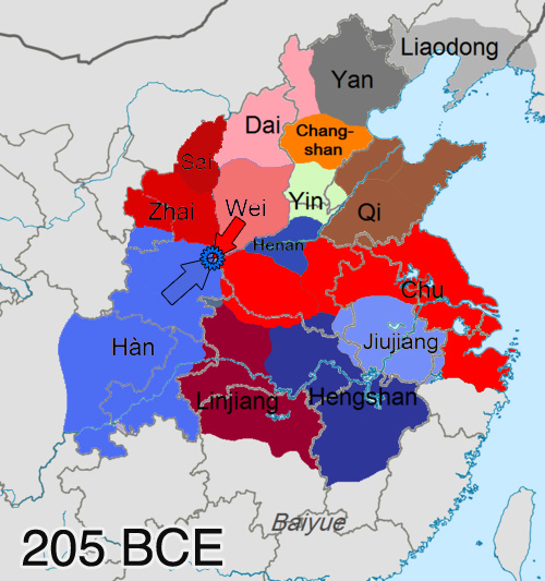 بدأت الحملة في صيف 205 ق.م بعد أن رُقي هان شين نائب رئيس وزراء. في مناورة تذكرنا بالإسكندر الأكبر في هيداسبس، ترك هان شين قوة تحت قيادة غوان ينغ على الضفة الغربية للنهر الأصفر لمواجهة جسوي في بابان، بينما تقدم سرًا نحو المنبع وبدأ في إنشاء الطوافات.