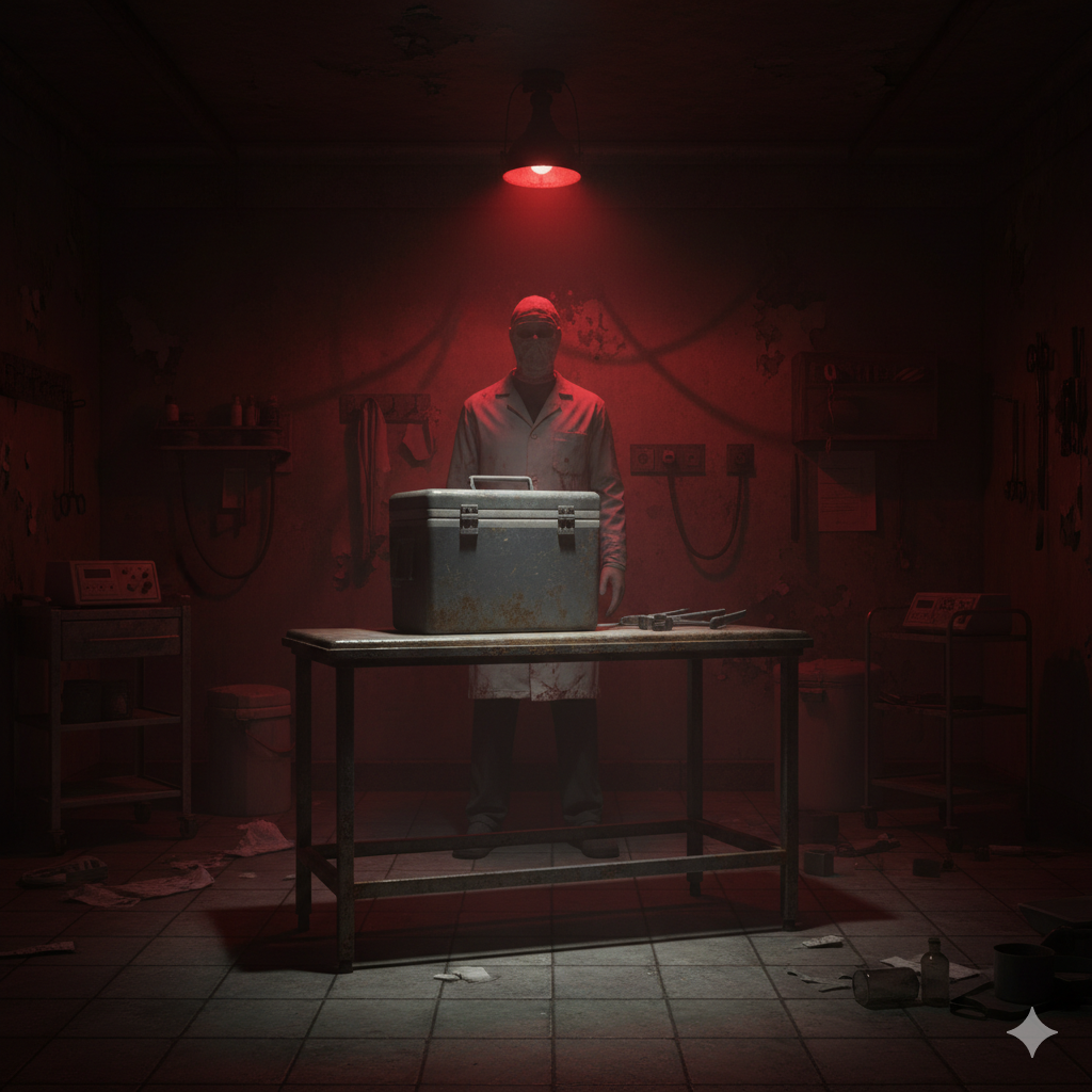 داخل الغرفة كانت هناك طاولة معدنية وأدوات جراحية مرتبة بعناية. 🔪