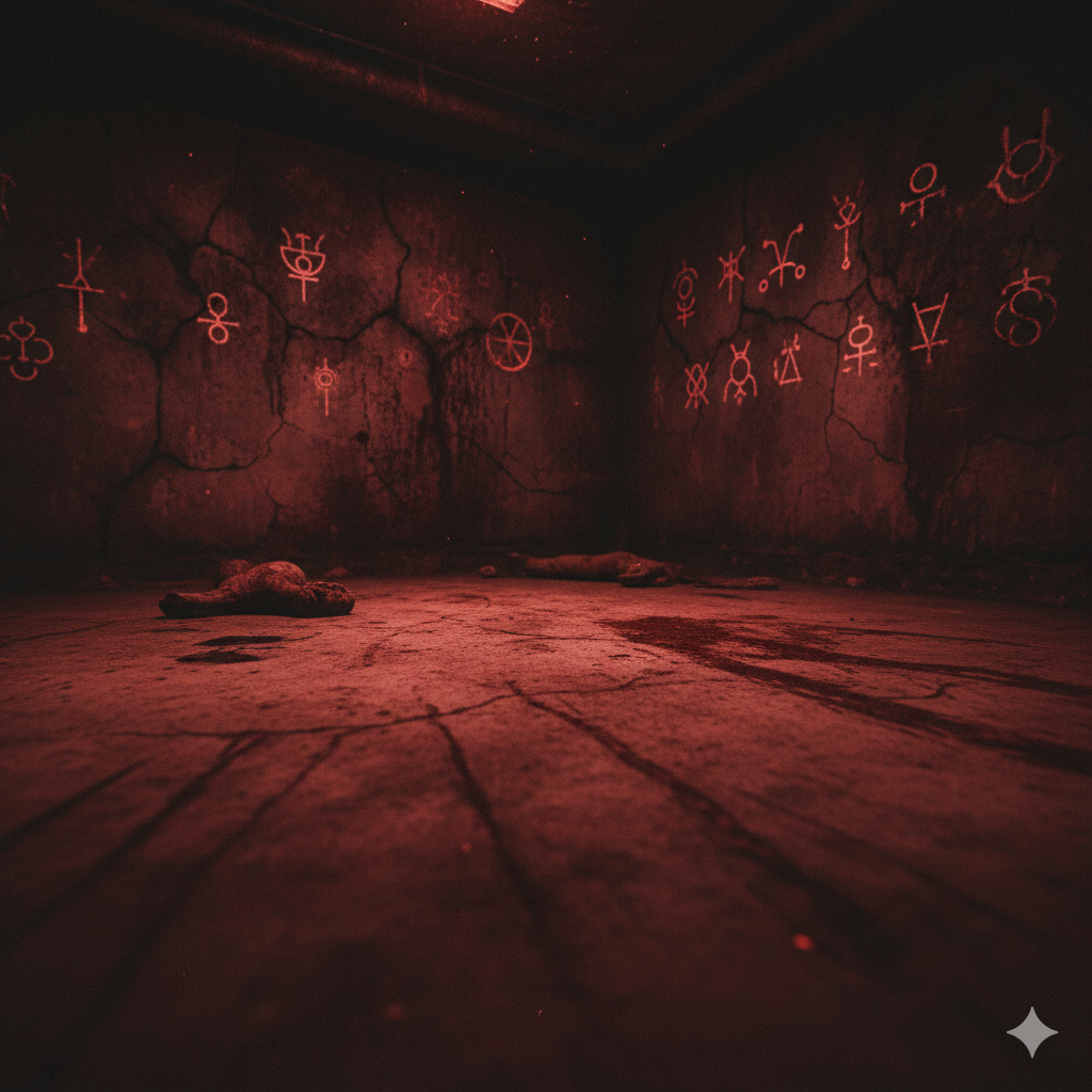 في القبو، وجدوا غرفة كبيرة مليئة بالدماء الجافة 🩸🪦، والتماثيل القديمة ⚱️ تتخذ أوضاعًا غريبة، وكأنها تحاول تحذيرهم. على الحائط كانت رموز محفورة بعناية، غير مفهومة ✨، لكن شعورًا بالرهبة كان يملأ المكان.