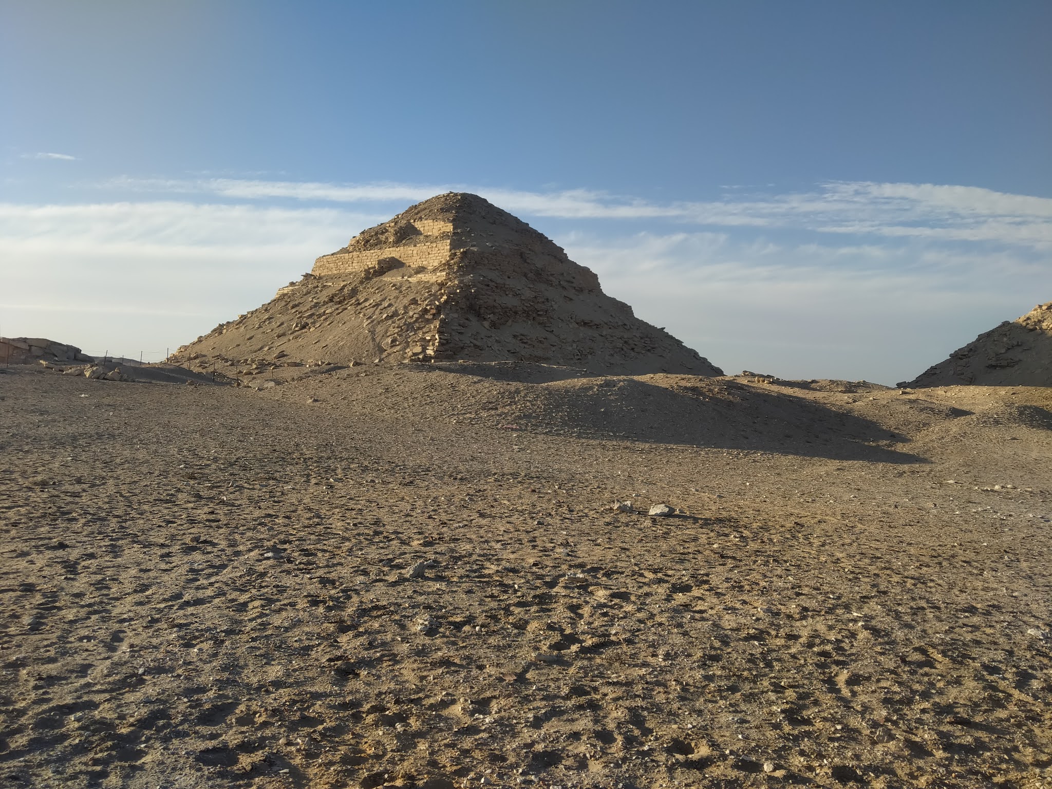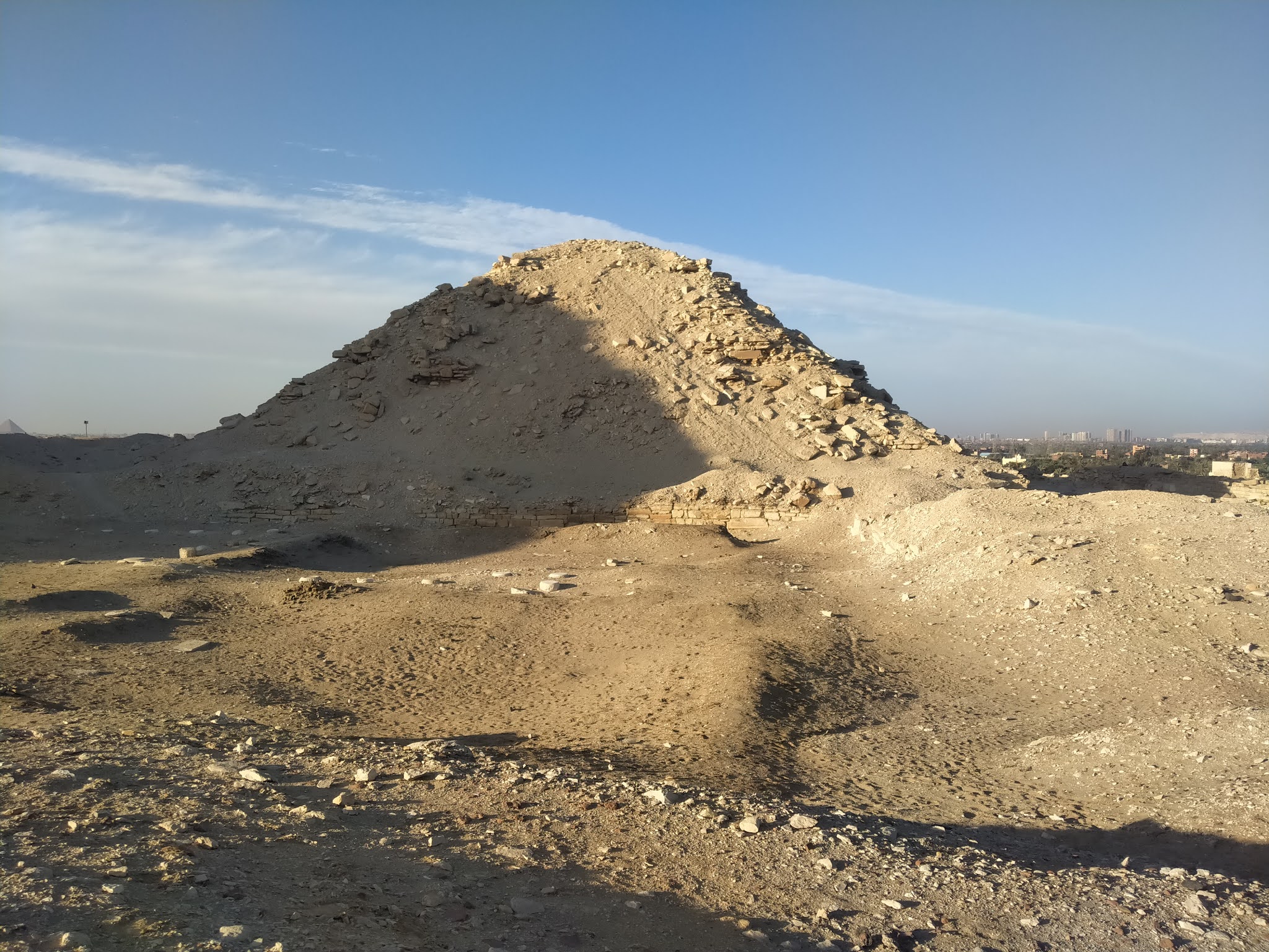 كان للهرم نواة متدرجة مبنية من الحجر الجيري ومغلفة بحجر جيري ناعم من طرة تم تجريد الغلاف بواسطة لصوص التجارة تاركين اللب مكشوفا للعناصر والنشاط البشري مما أدى إلى تقليص الهرم الذي يبلغ طوله ٥٢ متر الي كومة مدمرة